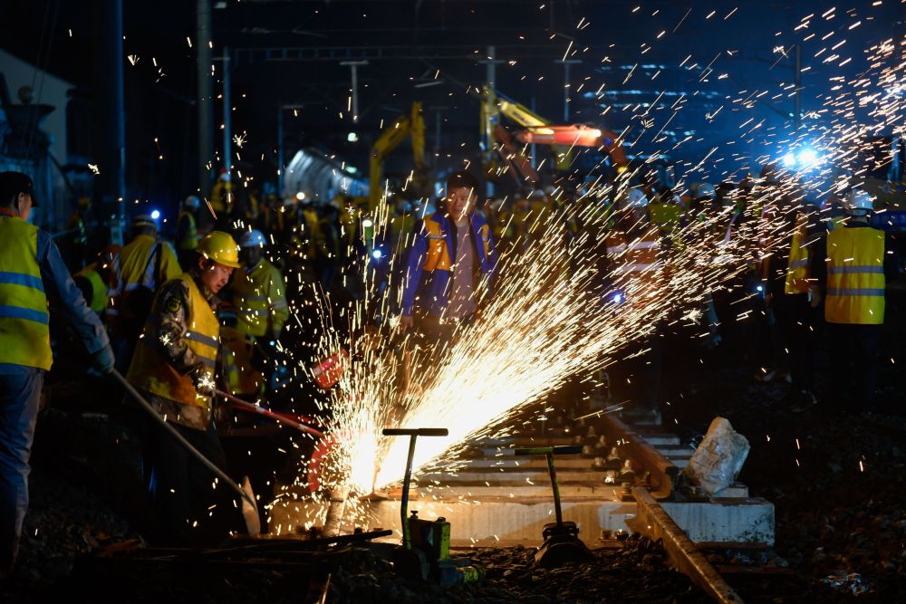 ↑4月13日,中铁四局工人在嘉兴站线路改造作业时切割铁轨。