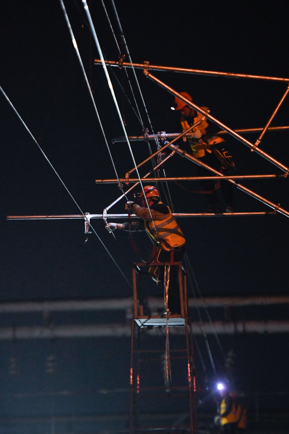 ↑4月13日,中铁四局工人在嘉兴站线路改造中进行接触网安装作业。